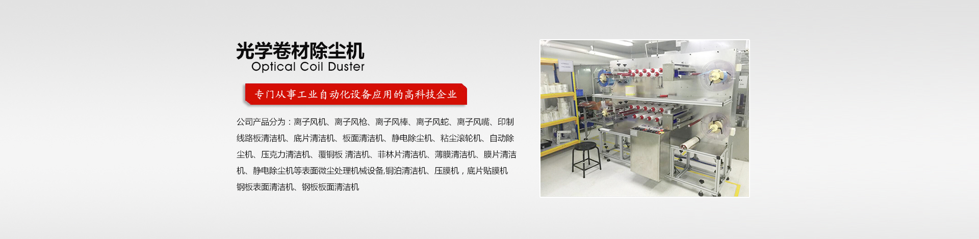 公司產品分為:離子風機、離子風槍、離子風棒、離子風蛇、離子風嘴、印制線路板清潔機、底片清潔機、板面清潔機、靜電除塵機、粘塵滾輪機、自動除塵機、壓克力清潔機、覆銅板